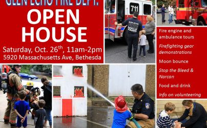 Please join Glen Echo Fire Department on Oct. 26th from 11-2 p.m. for our annual Open House – a fantastic event for the whole family! Some of the special activities we will feature: Exciting fire-rescue demonstrations including the fire hose and automobile extrication Silent Auction: Chief for the Day –…